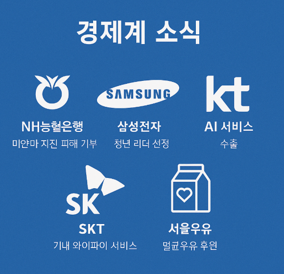 NH농협은행이 미얀마 지진 피해자들을 돕기 위해 1억 원을 기부했습니다. 삼성전자는 청년 리더 5명을 '제너레이션 17' 프로그램에 선정하였습니다. KT는 태국에 첫 LLM 플랫폼을 수출하며 AI 산업에 기여하고, SKT는 기내 와이파이 자동 로밍 서비스를 출시했습니다. 서울우유는 취약층에 멸균우유 28만 개를 후원할 계획입니다.