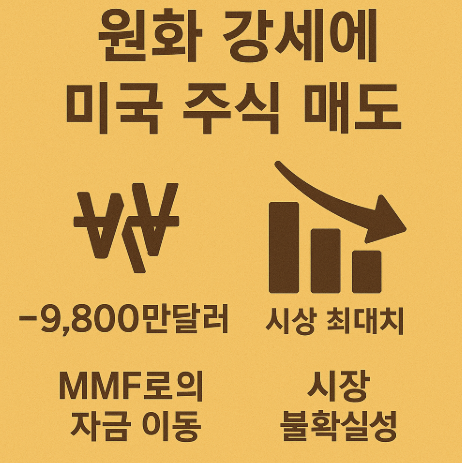 결론적으로, 최근의 원화 강세와 그에 따른 미국 주식 매도, MMF로의 자금 이동, 해외주식형 펀드에서의 자금 유출 등의 변화는 국내 투자자들의 불안 심리에 기초한 현상이며, 이러한 흐름은 앞으로도 지속될 가능성이 높습니다. 시장의 변동성과 동시에 환율 변동에 따라 투자 전략의 유연성을 유지하는 것이 필요할 것입니다.