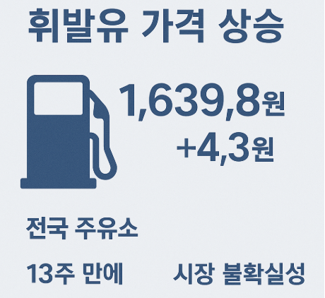 전국 주유소 휘발유 평균 판매 가격이 13주 만에 상승세로 전환했습니다. 최신 발표에 따르면, 이달 4일부터 8일까지의 휘발유 평균 가격은 전주보다 ℓ(리터)당 4.3원 상승한 1,639.8원에 달했습니다. 이는 국내 휘발유 판매가가 12주 연속 내림세를 이어온 후 나타난 변화입니다.